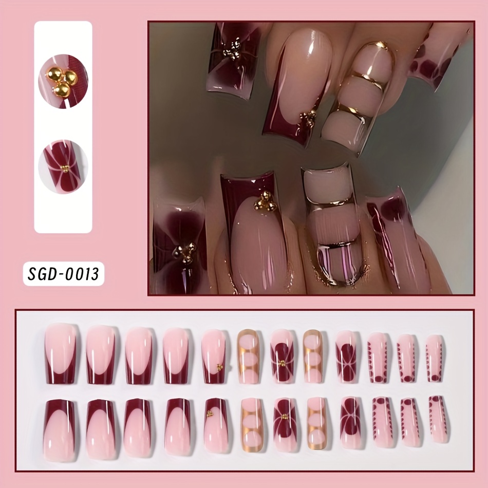 24pcs French Style Press On Nails Set - Glossy Pink, Red & Golden Ballet Shape Medium Length Fake Nails with Jelly Glue & Nail File, Easy Application Salon-Quality DIY Manicure Kit for, Parties, Weddings, Daily Wear (24 Nails