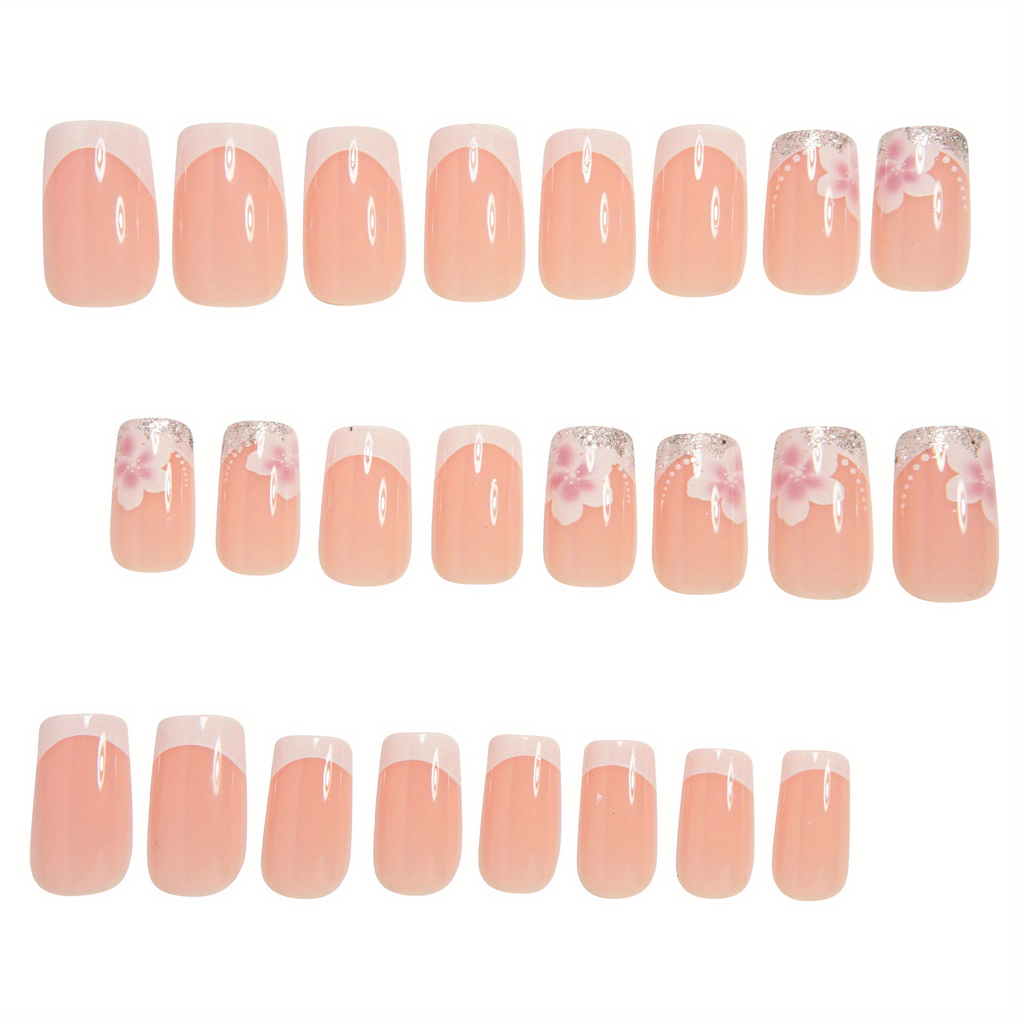 24pcs Glossy Chinese Square False Nails Classic Versatile Nude False Nails French High-end White French Press-on False Nails Spring White Pure Flowers Shiny Silvery Powder Full Coverage False Nails Nail DIY Suitable for Sprin