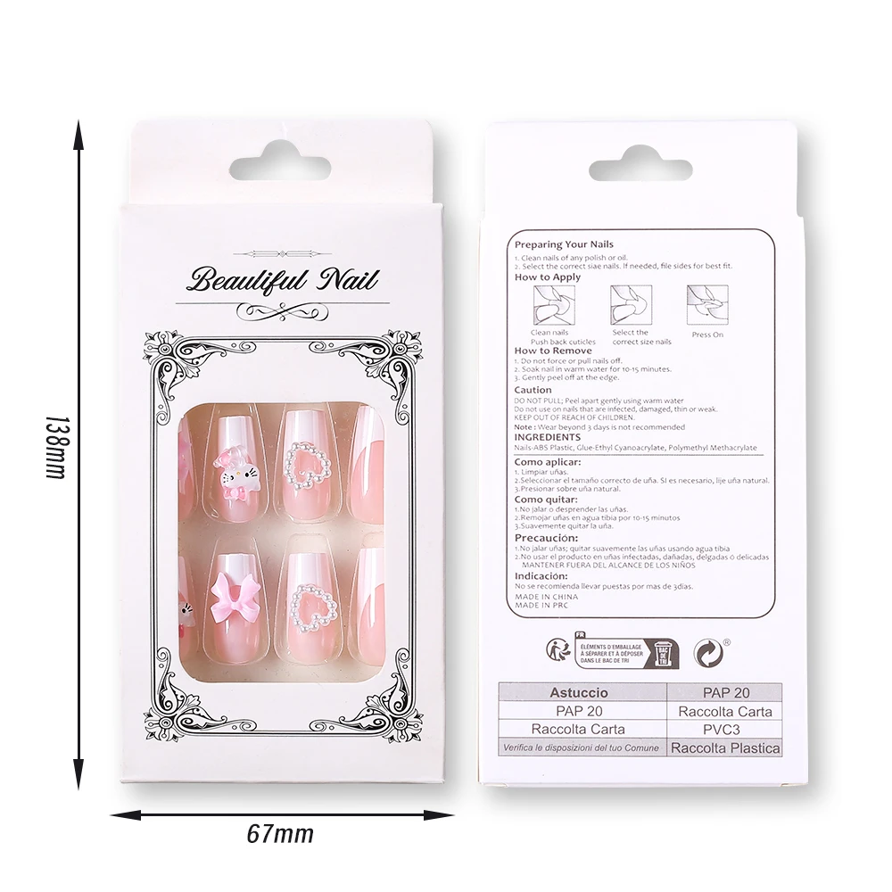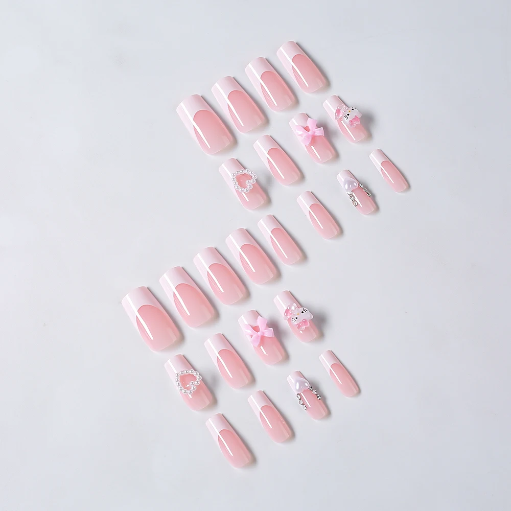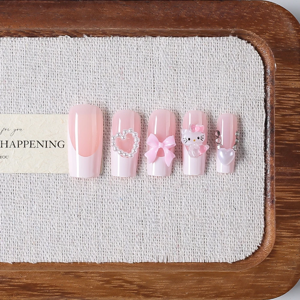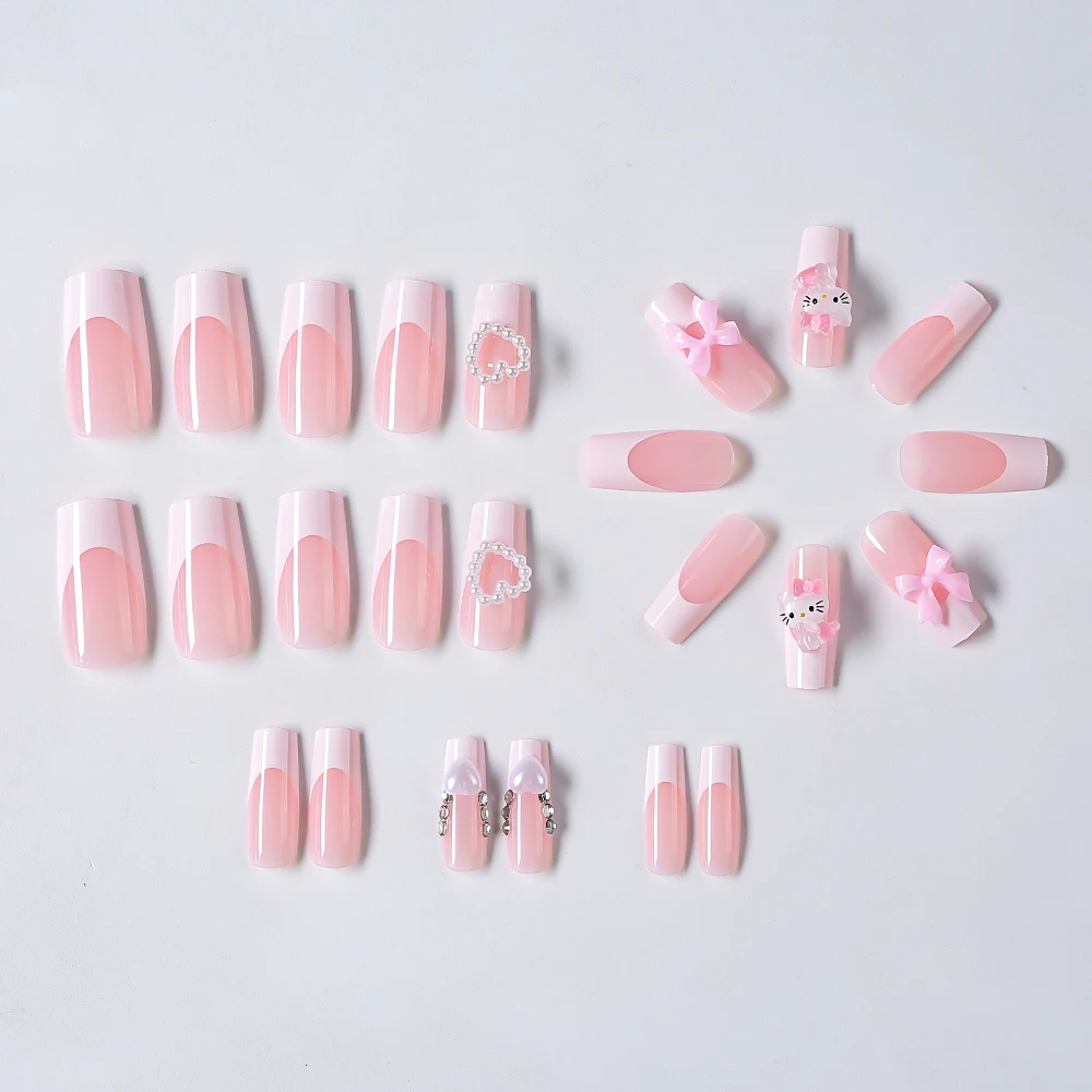 24pcs 3D Hello Kitty Bowknot Press on Fake Nails Pink Ballet Almond Wearable False Nails Kitty Cat Pearl Heart Design Fake Nails