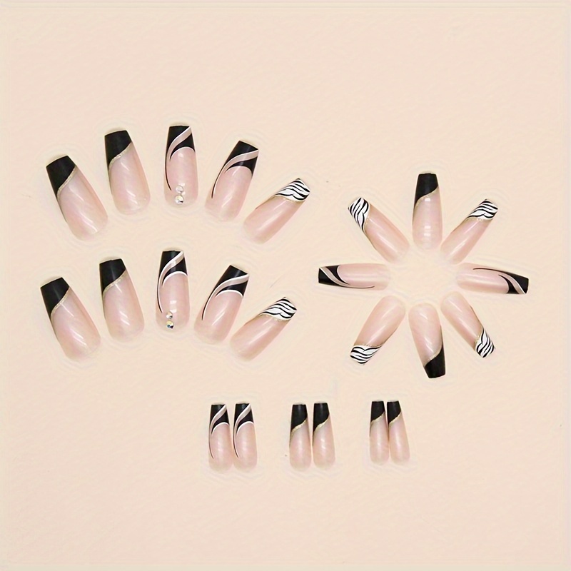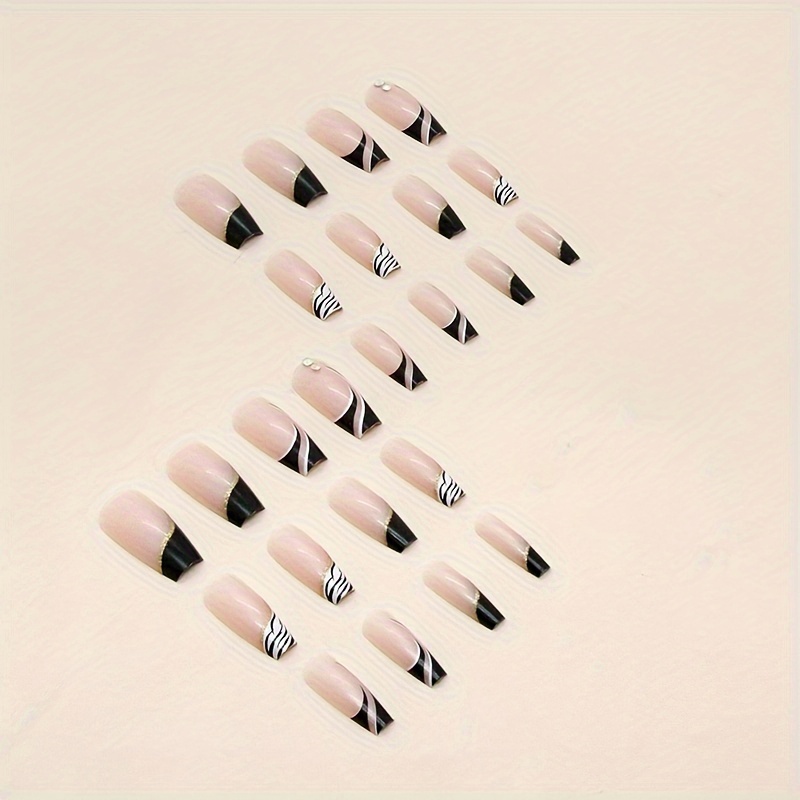 24pcs Medium-Length French-Style Ballet Press-On Nails, Black and White Zebra Print with Minimalist Rhinestone Design, Removable Press-On Fake Nails with Jelly Glue and Nail File, for Women and for Holidays, Parties, or Daily
