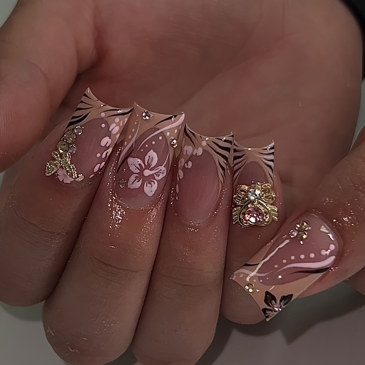 24pcs Short Square French-Style Fake Nails Set with Luxury 3D Sweet Heart Synthetic Gemstones, Elegant Golden Butterfly, and Charming Stamen Design. Suitable for All Women and. Includes Nail Buffer and Jelly Glue for Easy App