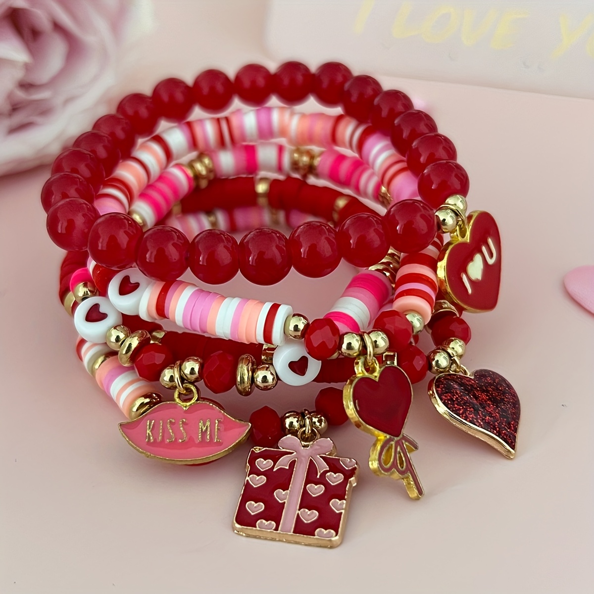 5pcs Valentine's Day Soft Clay Bead & Heart Charm Bracelets Compatible for Couples - Elastic Stretch Beads, Love Token Gift, Everyday (No Metal, Year-Round Wear)
