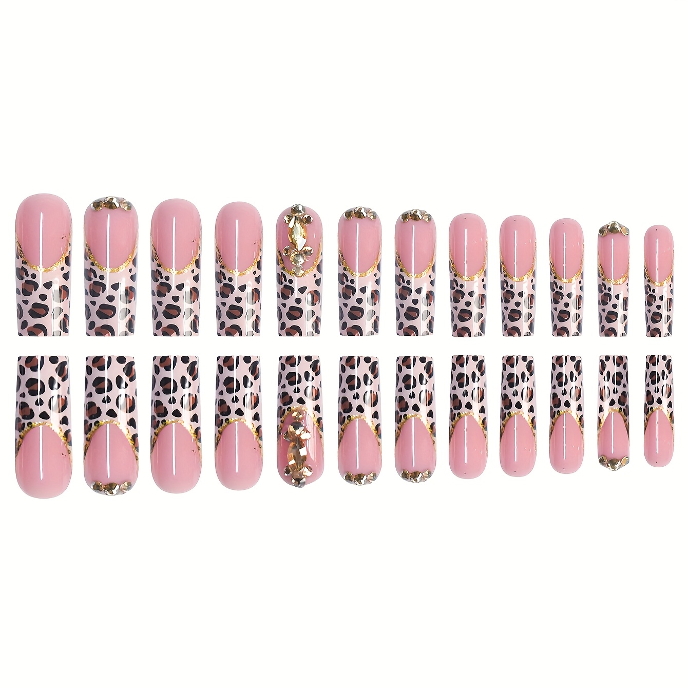 A Set of 24 Long Coffin-Shaped False Nails, Fashionable, Sweet And Cool Leopard Print, Luxurious Golden Diamond-Shaped Diamonds, Suitable for All Women And, Nail Polish And Jelly Glue Are Included in The Box, Easy to Stick An