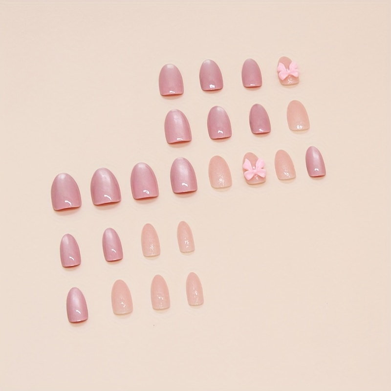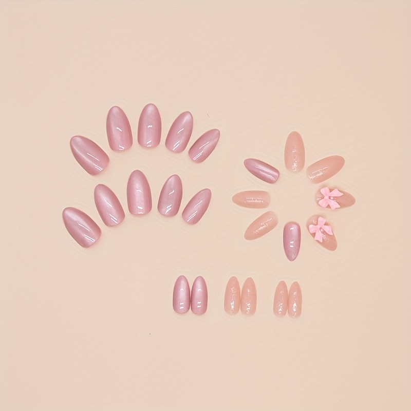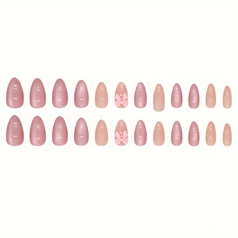 Almond Shape Short Press-On Nails with Glossy Pink Bow Design - Reusable Fake Nails for Women, Easy Apply & Remove, Elegant Everyday & Special Occasion Nail Art