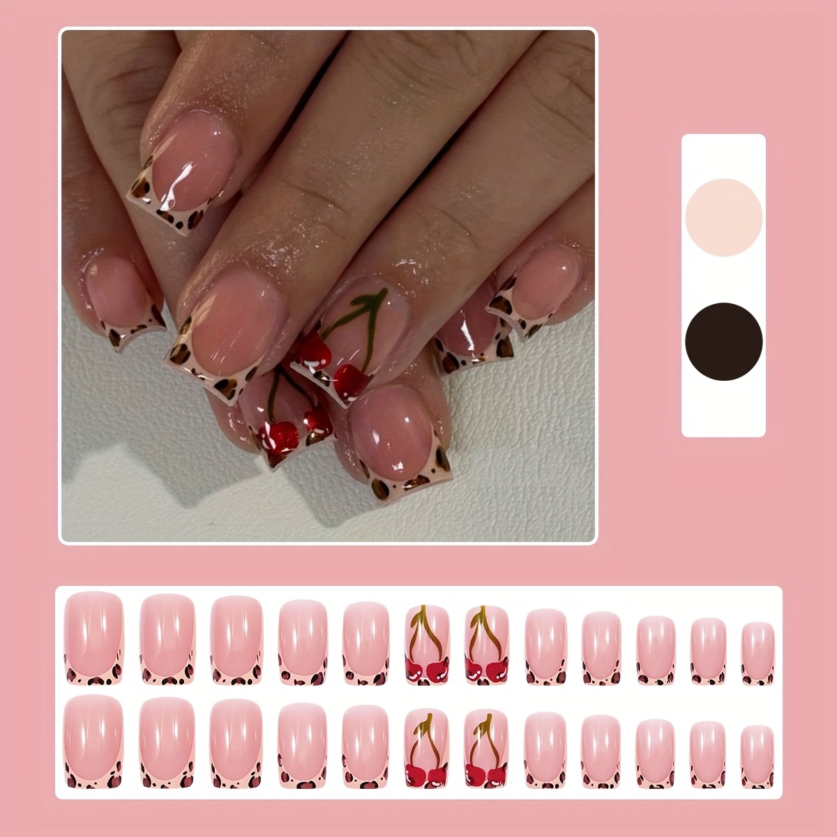 Leopard Print Short Press-On Nails for Women - Square Cherry Design, Sweet & Stylish Full Coverage Reusable Fake Nails for Autumn/Winter, 24pcs Gift Set